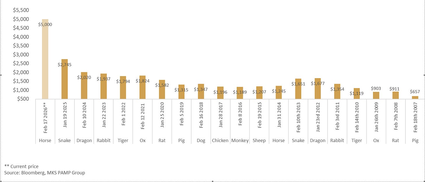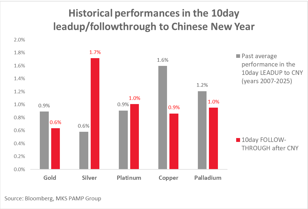 Gold in RMB terms is expensive but seasonal patterns around Chinese NY are supportive for Metals - Charts from Nicky Shiels at MKS PAMP below